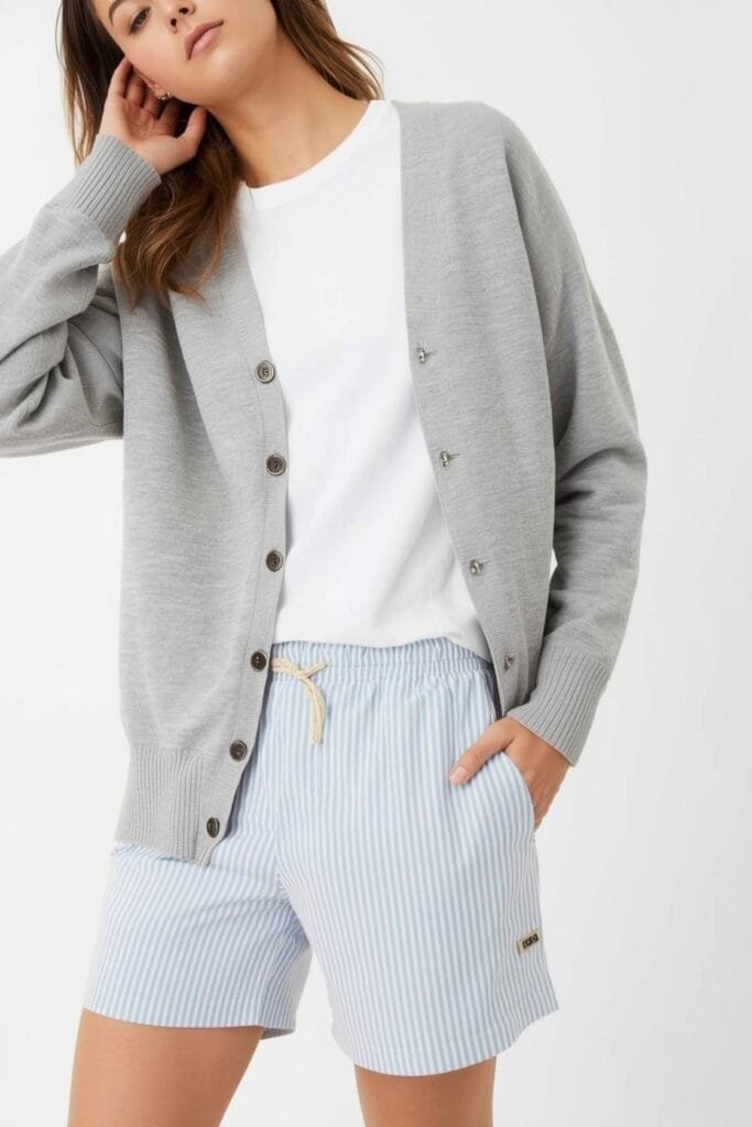 The high waist balances the shorter cardigan length, creating a flattering silhouette. Meanwhile, the relaxed tee keeps the look comfortable.