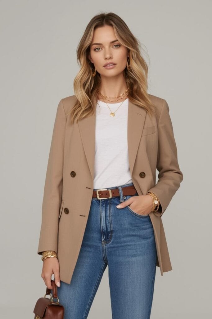 Choose a blazer slightly oversized in the shoulders. This modern cut creates a sophisticated silhouette and layers well over basic tops.